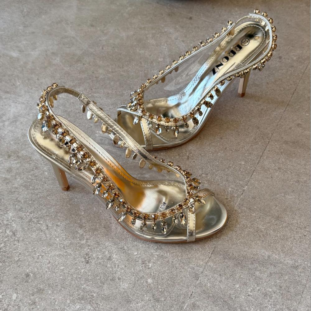 تميّزي بإطلالة ساحرة مع هذا الحذاء الذهبي الشفاف من Bronz، بتصميم أنثوي فاخر مرصّع بالفصوص اللامعة على الحواف ليمنحك لمسة راقية لا تُقاوم. يأتي بكعب رفيع أنيق يبرز جمال القدم ويضفي طابعًا فخمًا على كل خطوة. مثالي للأفراح، المناسبات الخاصة، والسهرات الفاخرة.