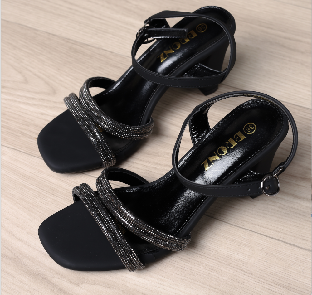 صندل نسائي أسود بكعب عالي وأحزمة متقاطعة مرصّعة – برونز