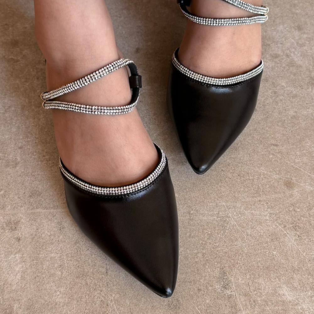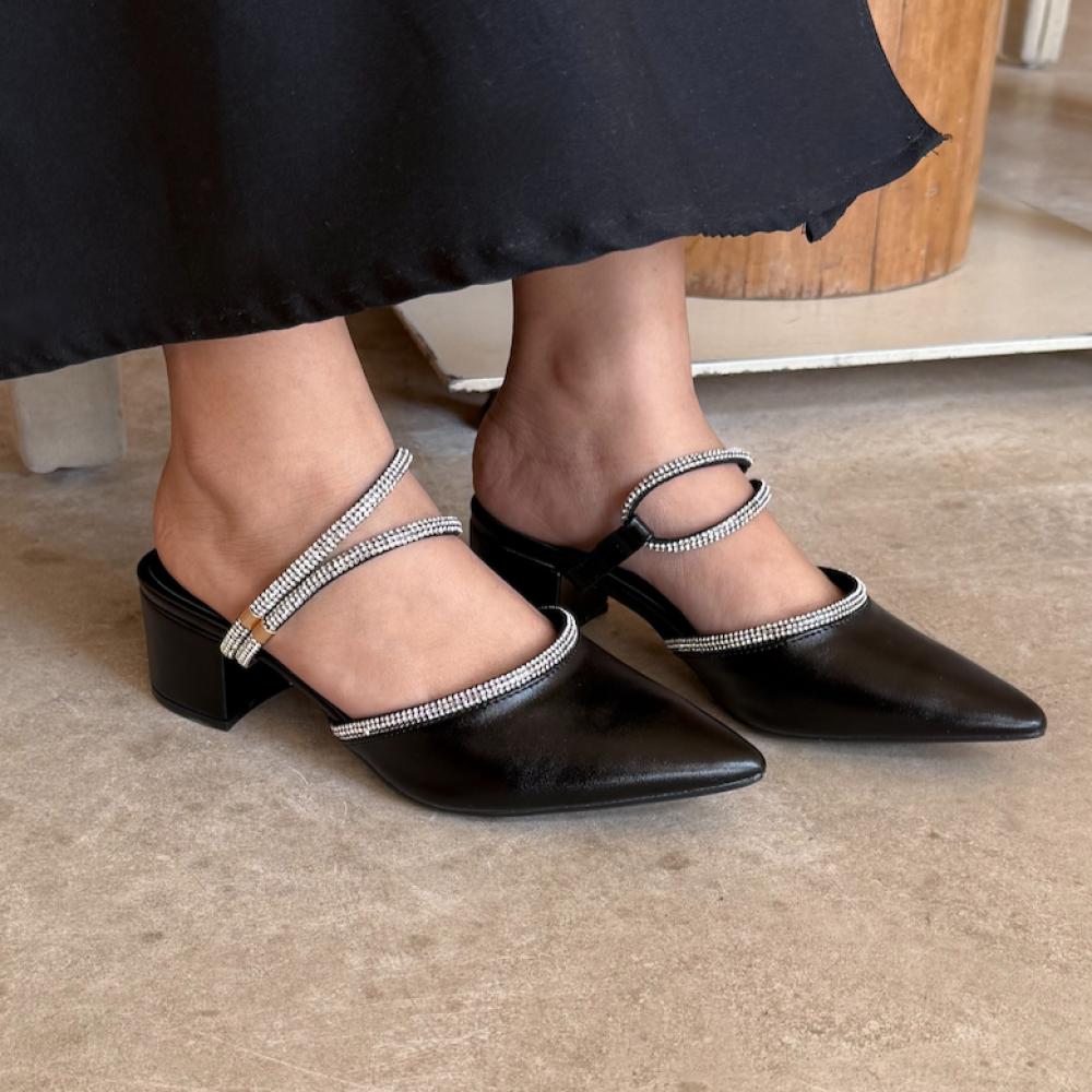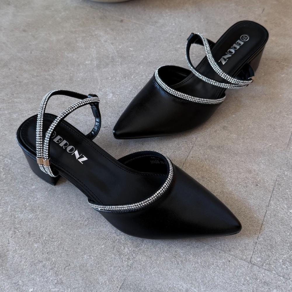 أبرزي أناقتك مع هذا الحذاء الأسود المميز من Bronz، بتصميم أنثوي راقٍ يجمع بين العملية والفخامة. يتميز الحذاء بمقدمة مدببة أنيقة مع حزامين مزخرفين بالفصوص اللامعة لمسة من الترف العصري، بالإضافة إلى كعب متوسط عريض يمنحك راحة وثبات في المشي طوال اليوم.