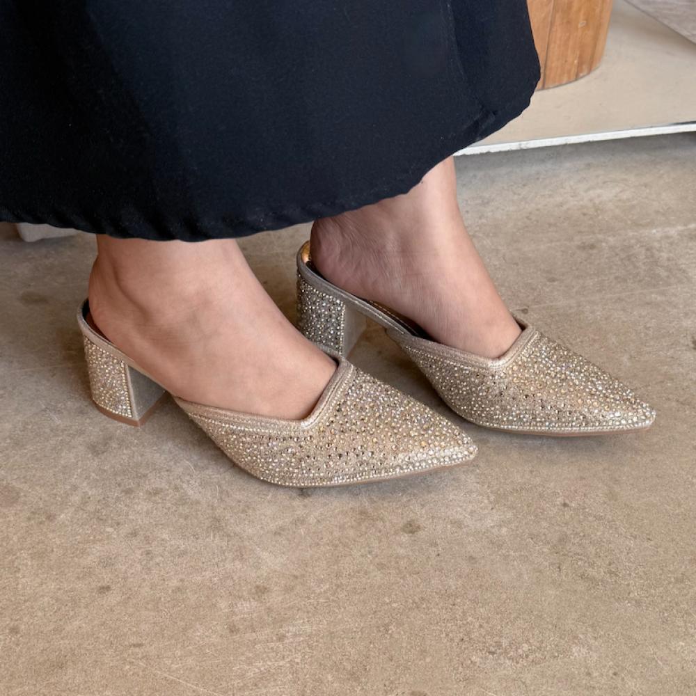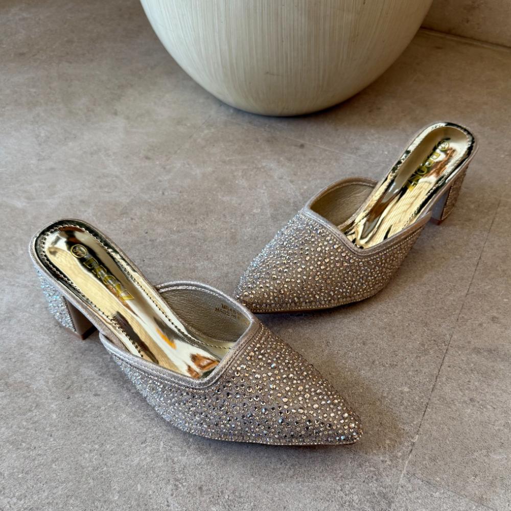 أضيفي لمسة فاخرة إلى إطلالتك المسائية مع هذا الحذاء الذهبي الراقي من Bronz بتصميم مرصّع بالكامل بالفصوص البراقة. يتميز بكعب عريض متوسط لتوفير الراحة والثبات، مع تصميم مفتوح من الخلف لسهولة الارتداء. مثالي للسهرات، المناسبات، أو لوك رسمي أنيق.