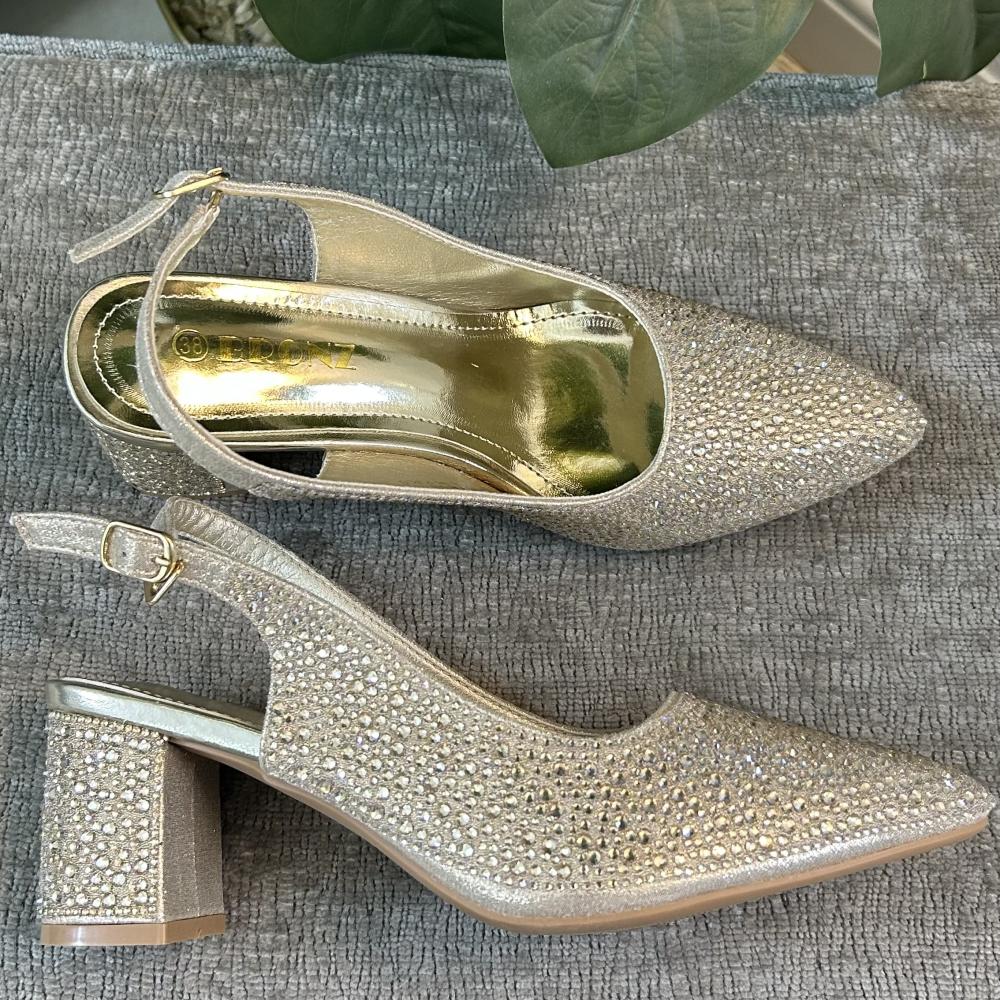 تميّزي بالأناقة والفخامة مع هذا الحذاء الذهبي من Bronz. بتصميم مرصّع بالكامل بالفصوص اللامعة ليمنحك بريقًا يخطف الأنظار، مع كعب عريض متوسط يوفر الراحة والثبات، وحزام خلفي قابل للتعديل لمقاس مثالي. خيار مثالي للأفراح، السهرات، والمناسبات الخاصة.